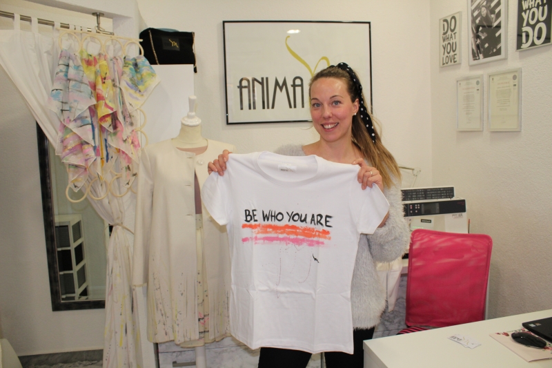 Tutto lo spazio del suo studio irradia proprio il suo carattere allegro, così come le sue magliette dipinte a mano, tra cui abbiamo attirato la nostra attenzione quella con la forte scritta “I don’t care”, per la quale ci ha informato che c’erano solo pochi pezzi e abbiamo sentito il bisogno di averli immediatamente perché come dice la stilista stessa: “Se una cosa ti piace, devi prenderla subito perché altrimenti c’è sempre la possibilità che non la ritrovi più.”. Naturalmente oltre alla maglietta abbiamo chiesto a Mirna anche alcune informazioni sulle sue attività attuali, che potete vedere qui sotto.